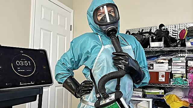 Cristal Kinky rubber doll using Sniffer toy on gasmasked rubber sub