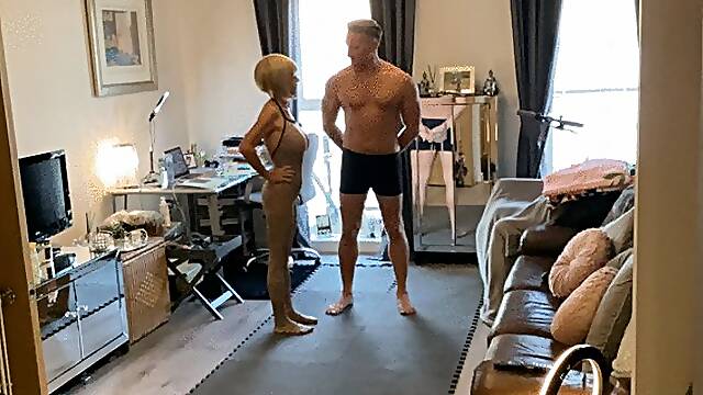Mixed Wrestling Blonde MILF teaches Younger hunk how to wrestle