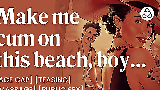 Guy gets caught masturbating on the beach by blonde mature Even and gets help