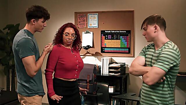 Big tits teacher fucks two students